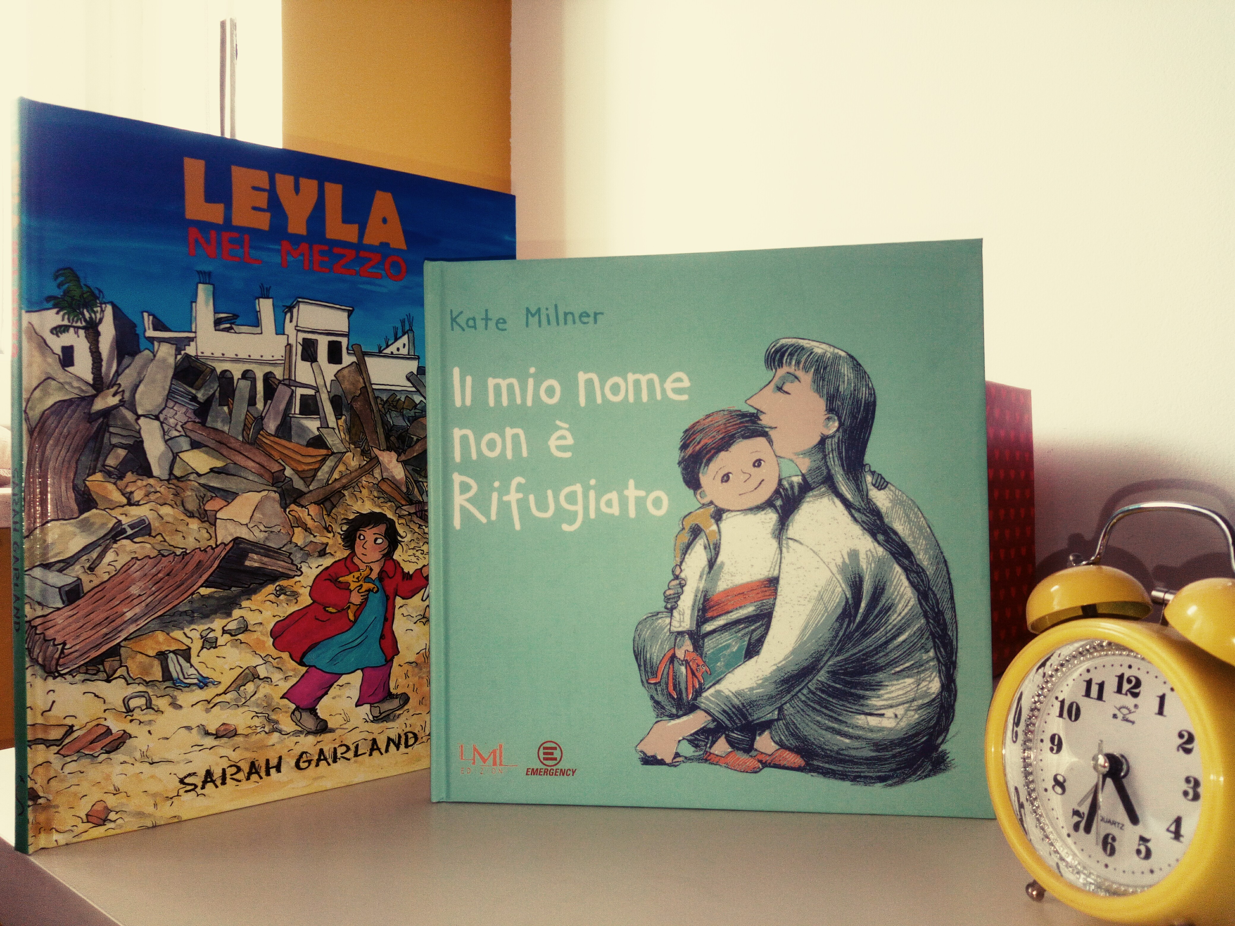 Il primo, Leyla nel mezzo, scritto ed illustrato da Sarah Garland, è edito da Lo Stampatello; l’edizione originale è del 2012, così come la traduzione italiana. È una graphic novel per bambini, nella quale le illustrazioni – vivide come in un cartone animato, intense e al contempo morbide ed espressive – sono le protagoniste principali. Leyla, una bimba paffutella dal capello movimentato, vive in un paese in guerra. Una guerra che è sempre meno sullo sfondo e invade sempre di più i giochi con gli amici, la strada per andare a scuola, la sua quotidianità condivisa con i genitori e la nonna. Una sera, all’improvviso, mamma e papà decidono che è il momento di lasciare il paese: sono in pericolo. Leyla li aiuta a preparare un bagaglio in tutta fretta, saluta con tristezza la nonna ed inizia un lungo viaggio che fa paura: prima in macchina, di notte, tra le montagne, poi su una barca con tantissime altre persone, finchè, dopo molti giorni e notti, una mattina la nostra protagonista intravede le bianche scogliere di Dover. (Nell’adattamento la storia è ambientata in Italia, probabilmente per renderne più immediata la comprensione ai bambini italiani, ma da alcuni elementi, tra cui, appunto, le bianche scogliere di Dover, è chiaro che l’ambientazione originale è british).