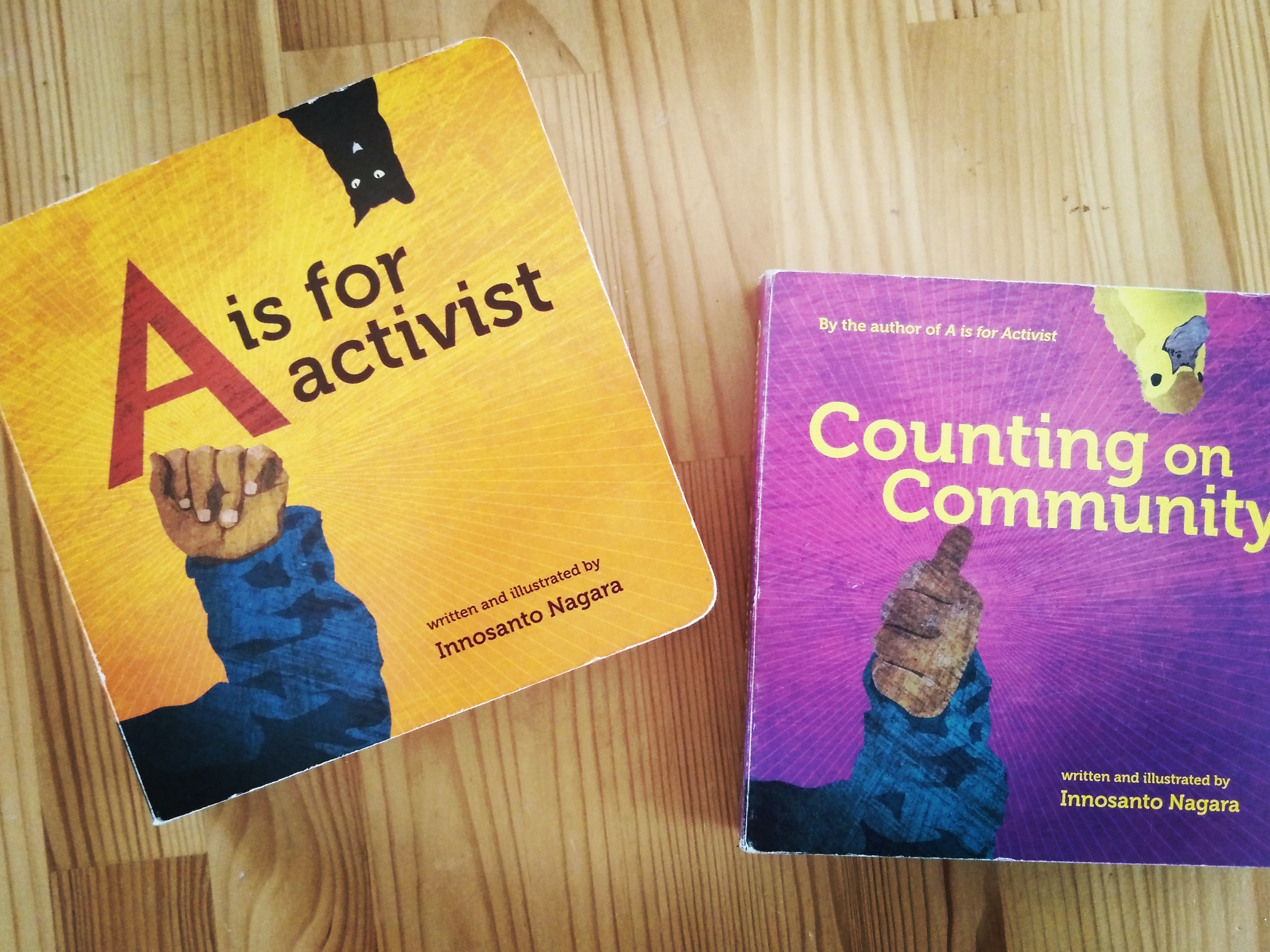 Oggi vi propongo un altro spuntino di lettura in breve: due piccoli cartonati dal respiro grande. Sugli scaffali delle librerie e non solo abbondano titoli ‘didascalici’, a volte bruttarelli e spesso poco originali, per insegnare ai cuccioli di sapiens sapiens le lettere dell’alfabeto e i numeri in età prescolare. Se sia utile o antiquato o altro, lo lascio valutare a chi è esperto di apprendimento. Vi volevo segnalare, però, la personale interpretazione di questo genere messa in atto da Innosanto Nagara, autore, graphic designer e attivista di origini indonesiano che vive negli Usa.
