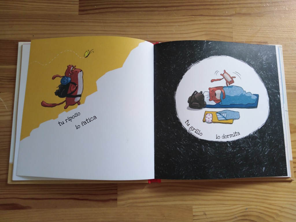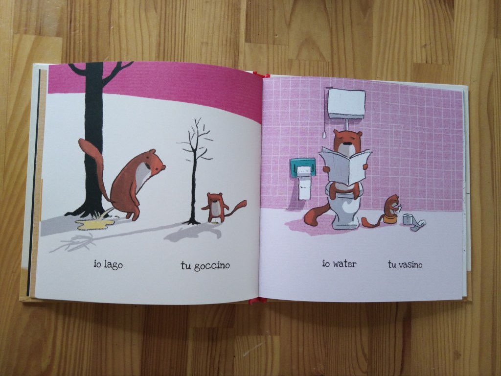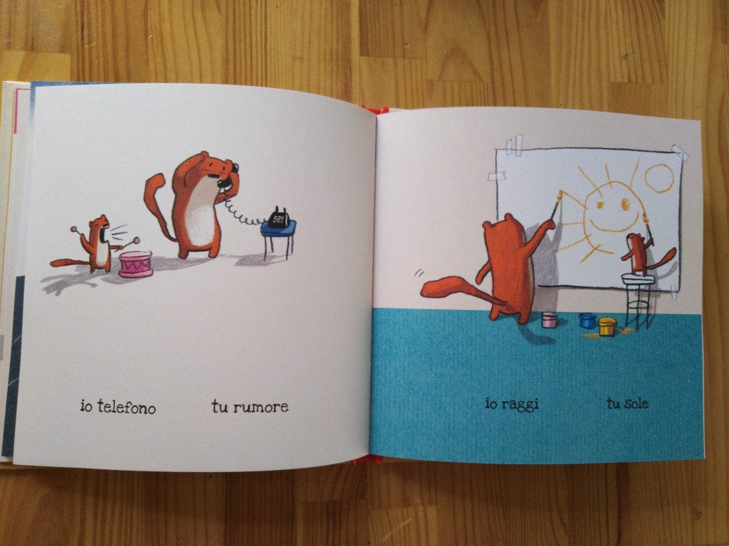 L’albo si gioca tutto su doppie tavole che mettono in contrapposizione e in relazione grande e cucciolo in una serie di situazioni quotidiane. Il testo è essenziale ma molto efficace nell’accompagnare le illustrazioni in una girandola di sfumature buffe e ironiche.
