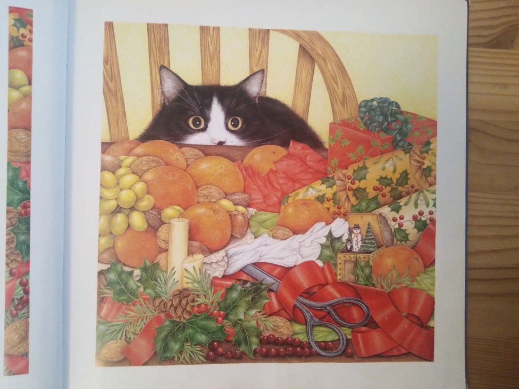 Le autrici ci portano a scoprire una vigilia di Natale d’altri tempi dal punto di vista della gattina di casa, Pussycat. Il ghiaccio scricchiola sotto le zampine nelle pozzanghere, l’aria fredda le drizza il pelo e porta con sè profumi di pino, di arance, agrifoglio. In casa si sentono rumori delicati: il fruscio della carta velina, lo scrocchiare delle noci,le forbici che tagliano. Compaiono l’albero con le palline, le calze appese al camino. Una nevicata notturna invita Pussycat ad uscire e a rotolarsi nel prato, in un silenzio ovattato nel quale, ad un certo punto, inizia a sentire il tintinnio dei campanelli delle renne.