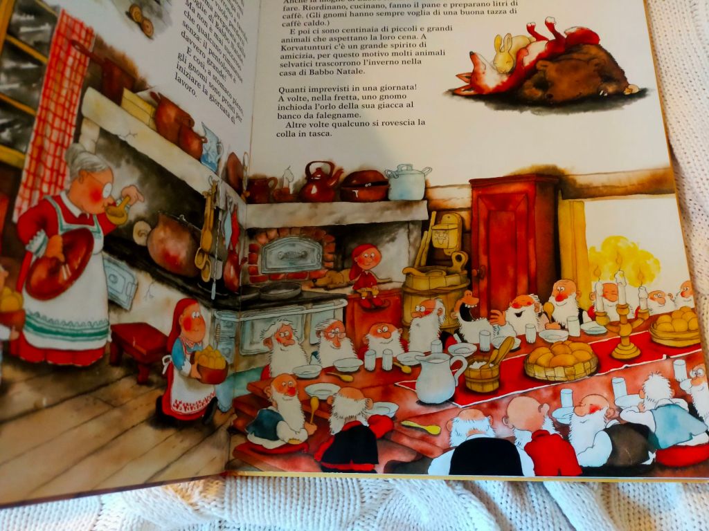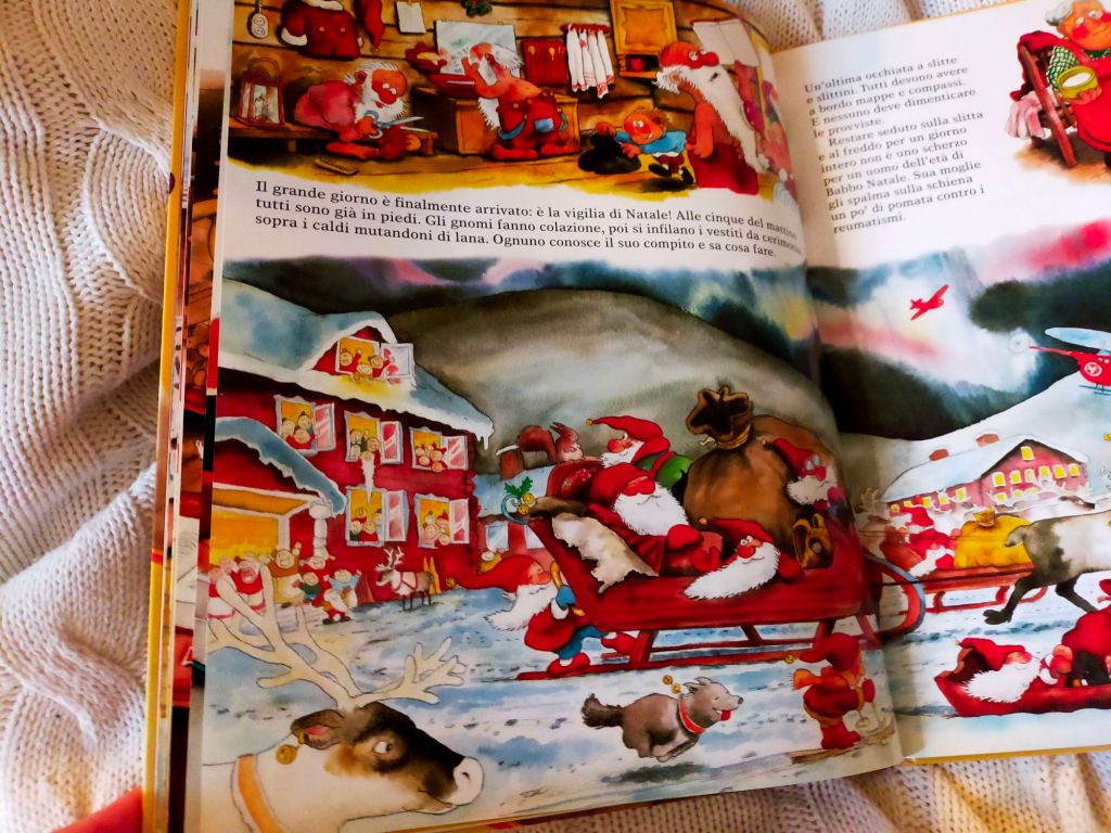 di Mauri e Tarja Kunnas, edito da Il gioco di leggere, mi era stato suggerito dalla mia amica Cecilia, perchè è il preferito del suo bambino. In questi giorni l’ho testato su Polpetta e devo dire che esercita un certo fascino sia su di lei (18mesenne) sia su di me (38enne, ma non faccio… testo). Un nuovo classico, questo albo del 1981 carico di tutto il colore e il calore dell’inverno nordico ci porta a Korvatunturi, in Lapponia, dove sorge il villaggio di Babbo Natale. Seguiamo Babbo Natale, e soprattutto la folla dei suoi aiutanti gnomi, nella loro vita quotidiana e nelle attività che per tutto l’anno si susseguono in preparazione della notte più magica.