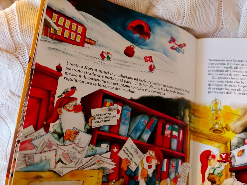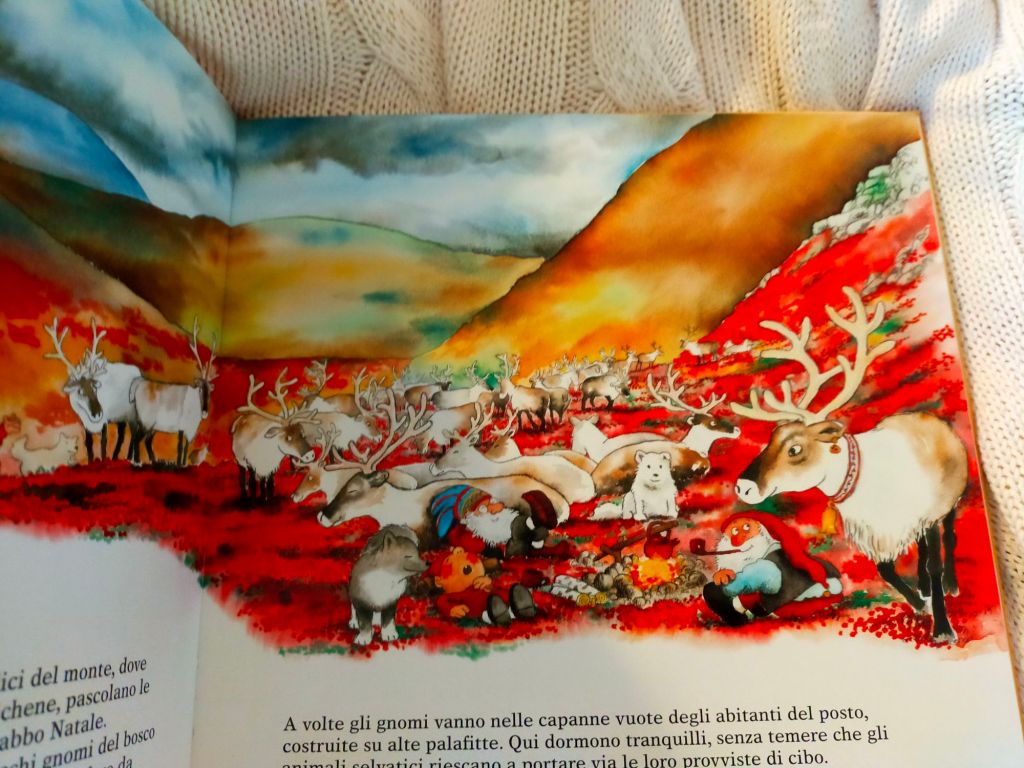 Entriamo nei laboratori di falegnameria e tipografia, nell’ufficio dove gnomi poliglotti smistano la corrispondenza (ammetto che per un istante ho pensato che nel caso fossi gnoma, mi candiderei per lavorare lì), nei pascoli dove le renne si rilassano in attesa della loro grande impresa. Ma sbirciamo anche nelle casette dove gli gnomi si rilassano e si riposano, nella scuola frequentata dai più piccoli, nella sauna, nella grande sala da pranzo.