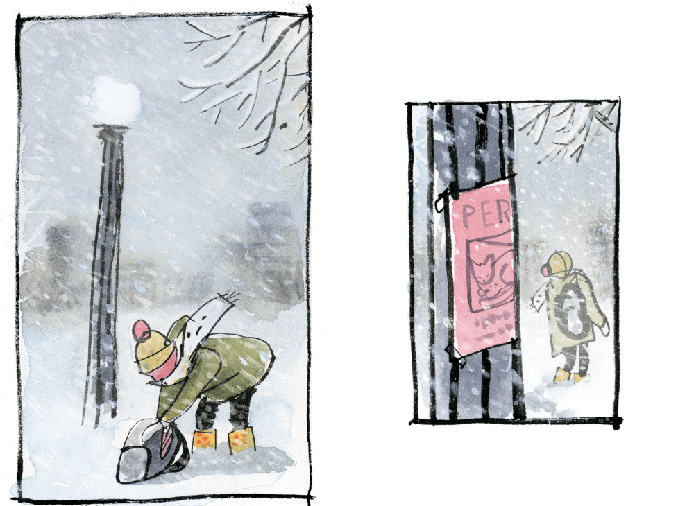 E il percorso del nostro protagonista inizia ad assumere un significato, e quello che poteva sembrare un bambino indifeso, vulnerabile, inizia a mostrare la sua agency: è piccolo ma sa dove sta andando, sa muoversi nel quartiere che conosce bene, ha un obiettivo. Ogni tanto lo vediamo attaccare ad un palo un cartello, per la ricerca del suo gatto scomparso. E intanto la sua voce interiore cerca di rassicurare il suo amico, ovunque sia. Gli suggerisce di evitare un certo vicolo, gli mostra un albero su cui nascondersi, un pescivendolo gentile che potrebbe regalargli un pesce, un angolino dove rannicchiarsi per trovare un po’ di calore, un altro dove accovacciarsi ed ascoltare qualcuno che suona il piano.