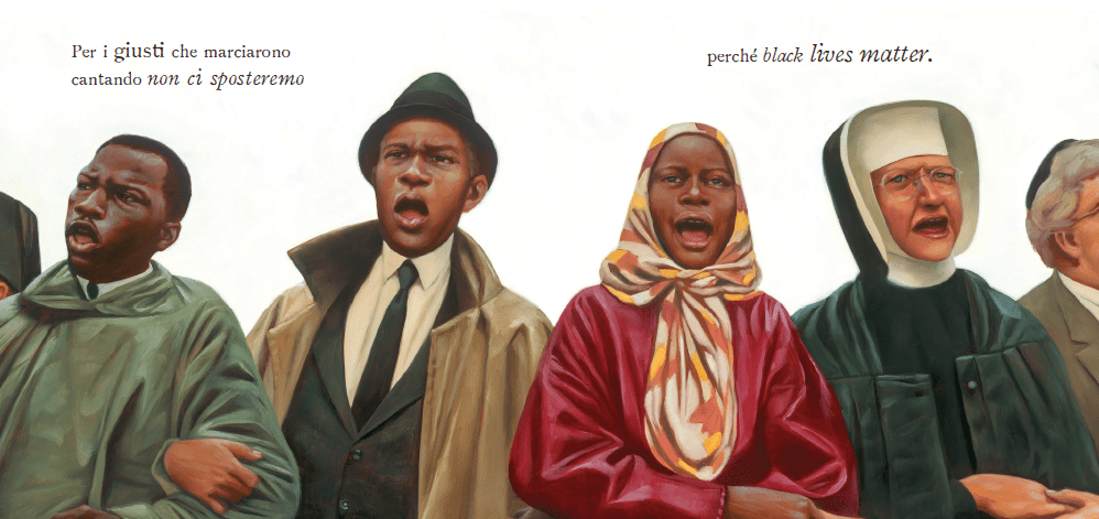 Digressioni a parte, questo albo a me ha fatto venire la pelle d’oca. Per le immagini potenti ed evocative, per il percorso che l’autore ha scelto di tracciare, saltando dal presente al passato e ritorno, osando rappresentare l’indicibile, dalla disumanizzazione totale della tratta degli schiavi ai crimini più recenti, al contempo celebrando la determinazione di chi è rimasto in piedi e ha saputo far brillare la propria luce affinchè il mondo la veda/senza fermarsi fino ai bagliori dell’alba. Ma anche ricordando chi non ce l’ha fatta. Moltissimi i volti famosi che si affacciano dalle pagine: sportivi, attivisti politici, musicisti, artisti, così tanti che andrebbero a costituire una lista troppo lunga qui (ma la trovate nell’appendice del libro, con tutti i riferimenti a personaggi, eventi storici e movimenti di appartenenza). Non so se riesco a rendere giustizia a questo libro che è un’esplosione di luce, ma voi, nel dubbio, leggetelo e regalatelo.