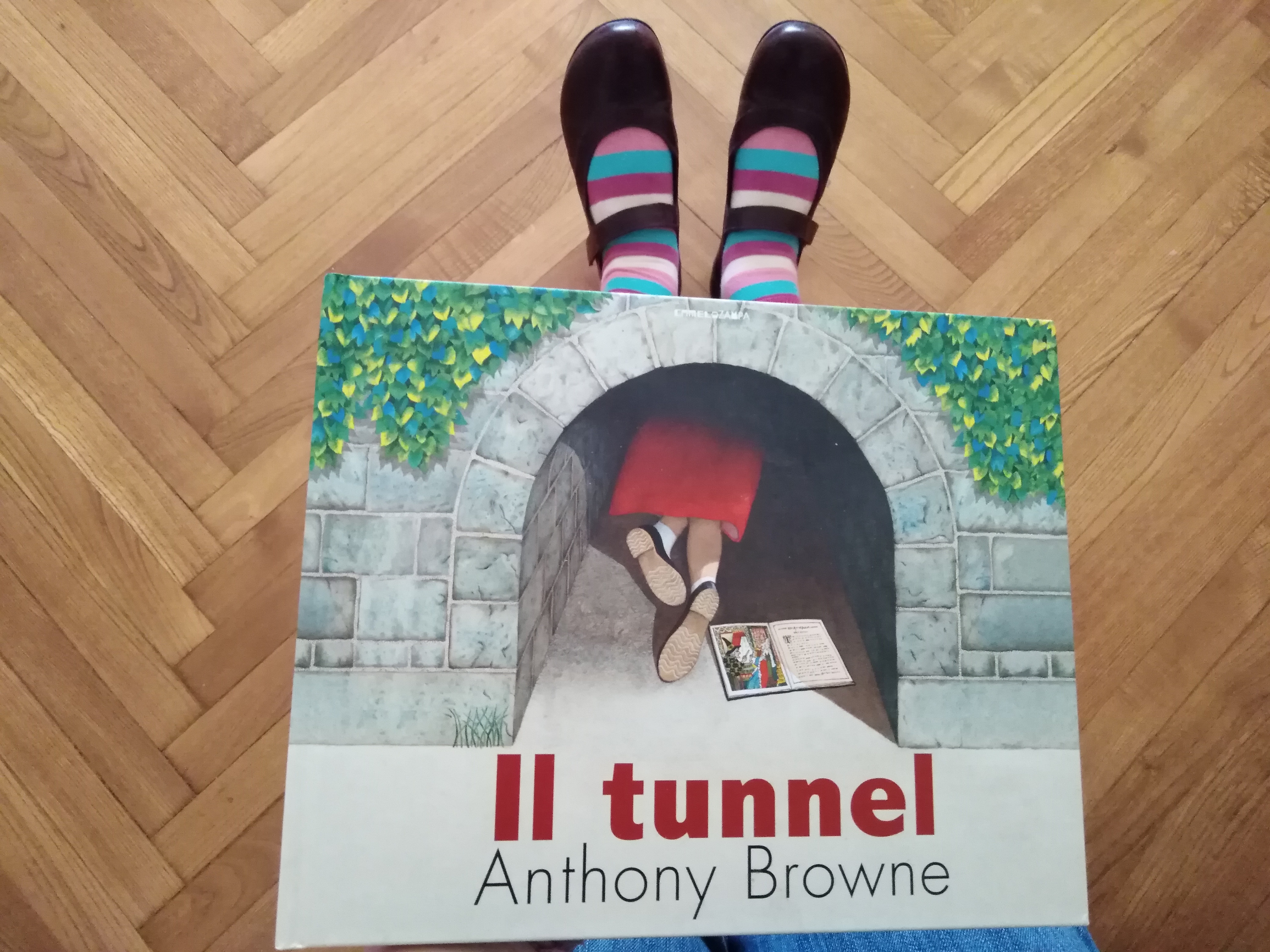 Polpetta deve ancora compiere due anni, e ha già avvertito la fascinazione degli albi illustrati di Anthony Browne. In questi giorni Il tunnel gira per casa nella nuovissima edizione di Camelozampa, e lo leggiamo in continuazione.