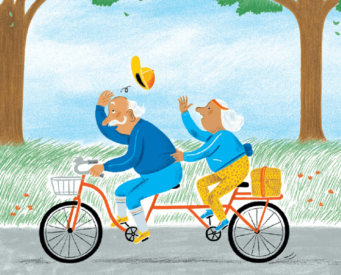 Un primo verso racconta i vecchi da un punto di vista esterno; il secondo, in corsivo, è la voce dei vecchi stessi. Dalla necessità di camminare piano, agli acciacchi e alle dentiere scomode, la terza età ha indubbiamente le sue seccature. I vecchi (almeno quelli di questo libro) vedono nello specchio e sentono nelle ossa i segni dell’età, ma il tempo non li spaventa e sanno anche resistere con caparbietà (per esempio, facendo ginnastica in tutine colorate).