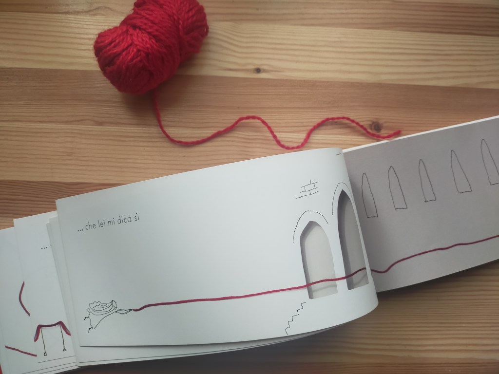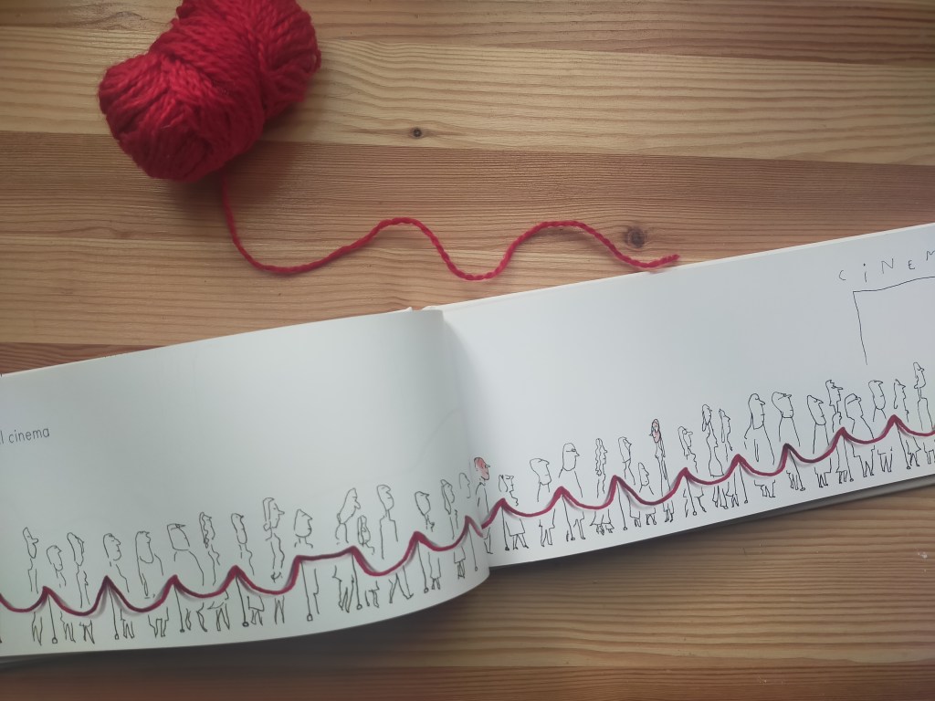 Quel filo sarà letteralmente il fil rouge che ci guiderà tra le pagine del libro, trasformandosi tra quelle pagine in tanti oggetti diversi e sottolineando le emozioni del protagonista.