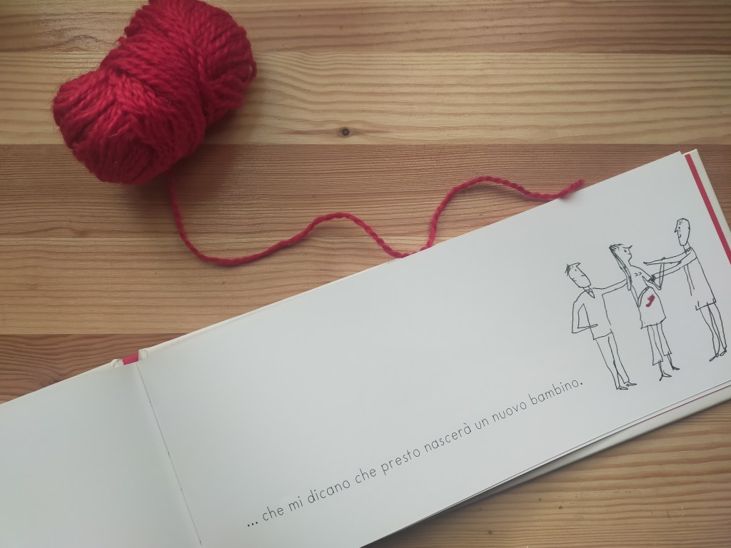 È un albo esile, minimalista, che ha il formato di una busta di quelle americane, allungate. Dalla finestrella trasparente in copertina spunta la testa di un bimbo, che tiene in mano un pezzetto di filo di lana rosso.