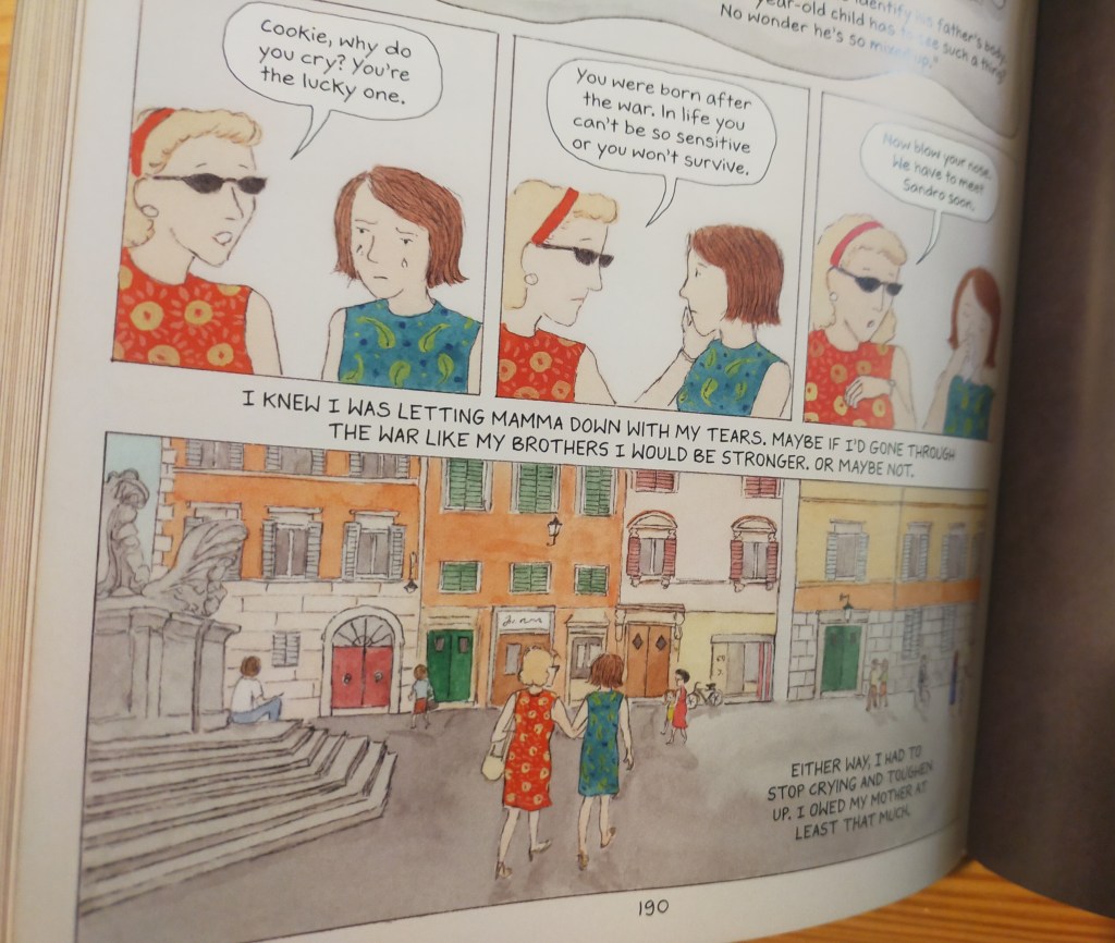Fuori da scuola, invece, trova ad aspettarla una vivace e rumorosa famiglia matriarcale ebraica, quella della madre, tedesca di origine polacca. Cookie ha un padre italiano assente e dal quale vorrebbe essere amata, anche se incontrarlo dal vivo l’ha delusa. E una madre, appunto, dalla personalità molto intensa, della quale conosceremo varie sfaccettature. Ha anche due fratellastri dai nomi italiani, molto più grandi e diversissimi tra loro, una nonna e due zie. Tutti questi parenti sono sopravvissuti, in vari modi, alla guerra e alla Shoah, e questi vari modi Cookie – nata negli Stati Uniti nel dopoguerra – li scoprirà un po’ per volta, crescendo. Così come noi scopriremo, poco per volta, le identità culturali composite, stratificate della protagonista e dei suoi familiari.