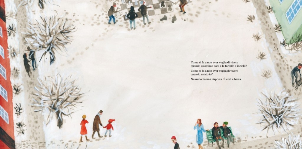 Il suo papà non c’è più. Il suo posto è vuoto al tavolo della colazione, ma nessuno le dice perché. Fino a che la mamma non la accompagna alla clinica dove il papà è ricoverato. I grandi le spiegano che il papà è così triste che non ha più voglia di vivere. Non si ricorda più come si fa ad essere felici, come si fa a volare, e in ospedale lo aiutino perché non voli via.