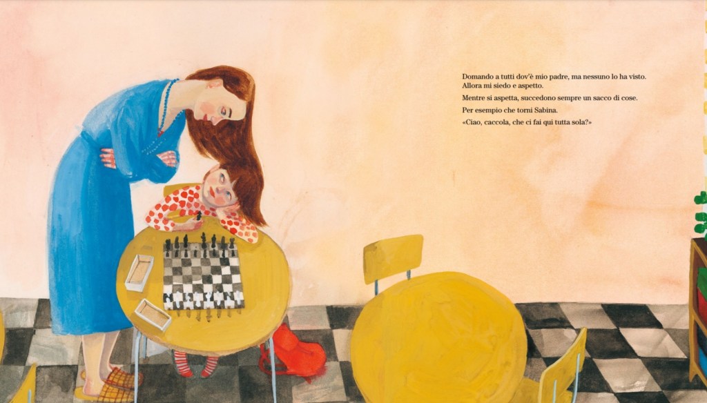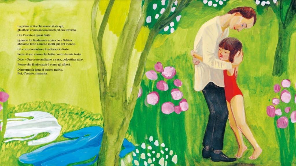 I mesi passano, e ad un certo punto il papà sta così male che non vuole più incontrare la sua famiglia. Allora la bambina continua ad andare in clinica, senza vedere il papà, ma facendo amicizia con una persona speciale, Sabina, che la porta a nuotare nell’erba e a vivere altre avventure tra i corridoi.