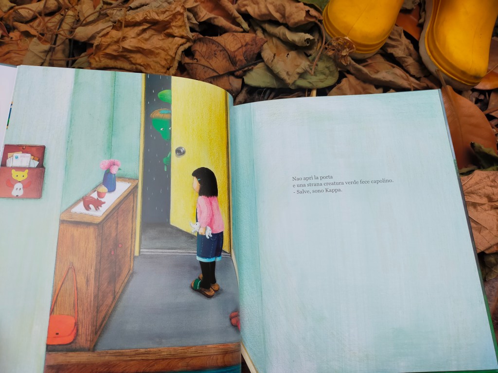 È una mattina piovosa quando la piccola Nao apre la porta di casa per trovarsi davanti un Kappa. La sua prima reazione è quella di nascondersi sotto il tavolo, e non ha tutti i torti, dato che queste creature mitologiche sono state per molto tempo utilizzate come babau per spaventare i bambini. Senza contare che il Kappa ha le sembianze di una specie di dinosauro verde con la chierica e una pozza d’acqua in cima alla testa. La mamma la rassicura: il signor Kappa oggi sarà il suo babysitter e non c’è niente di cui preoccuparsi.