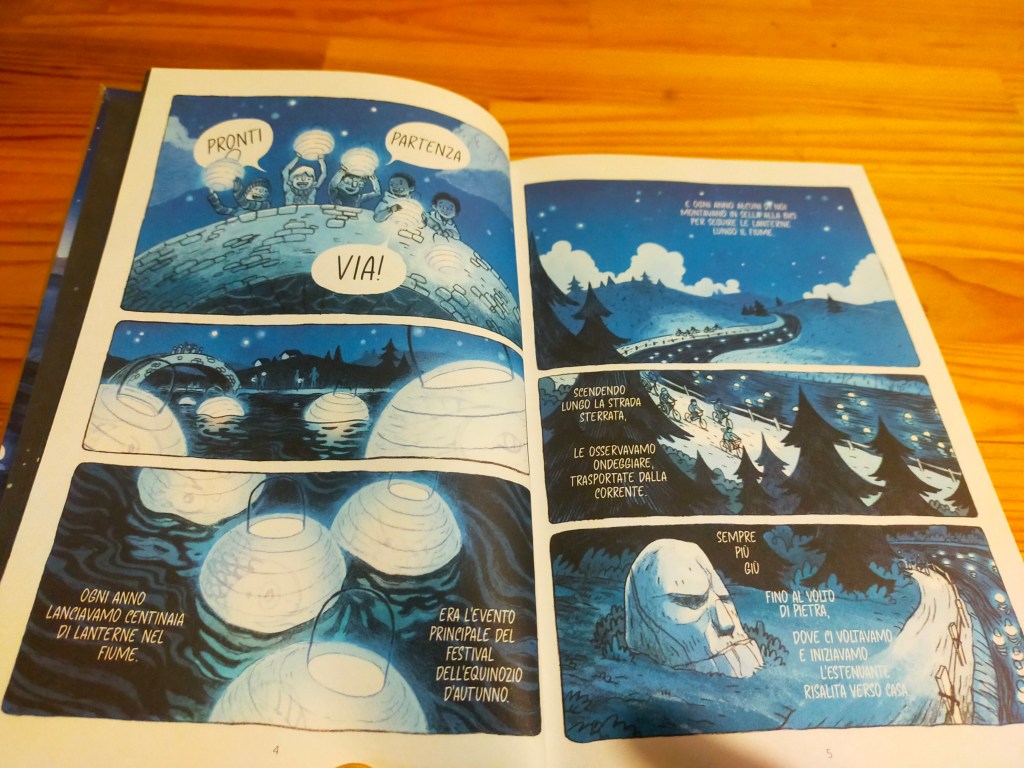 Ha una sequenza iniziale che ci trasporta subito in un immaginario leggermente nostalgico alla Stranger Things questa graphic novel di Ryan Andrews che è stata finalista al Premio Andersen 2022. E’ il festival dell’equinozio d’autunno e tutta la cittadina si raduna per lanciare, come da tradizione, centinaia di lanterne di carta illuminate nel fiume. Ogni anno Ben e i suoi amici seguono per un pezzetto il percorso delle lanterne scendendo in bici sulla strada lungo il fiume. Ma quest’anno sarà diverso dagli altri: i quattro ragazzini hanno stretto un patto. Nessuno torna a casa. Nessuno si volta indietro. Si spingeranno dove nessuno è mai arrivato, per scoprire dove finiscono le lanterne.