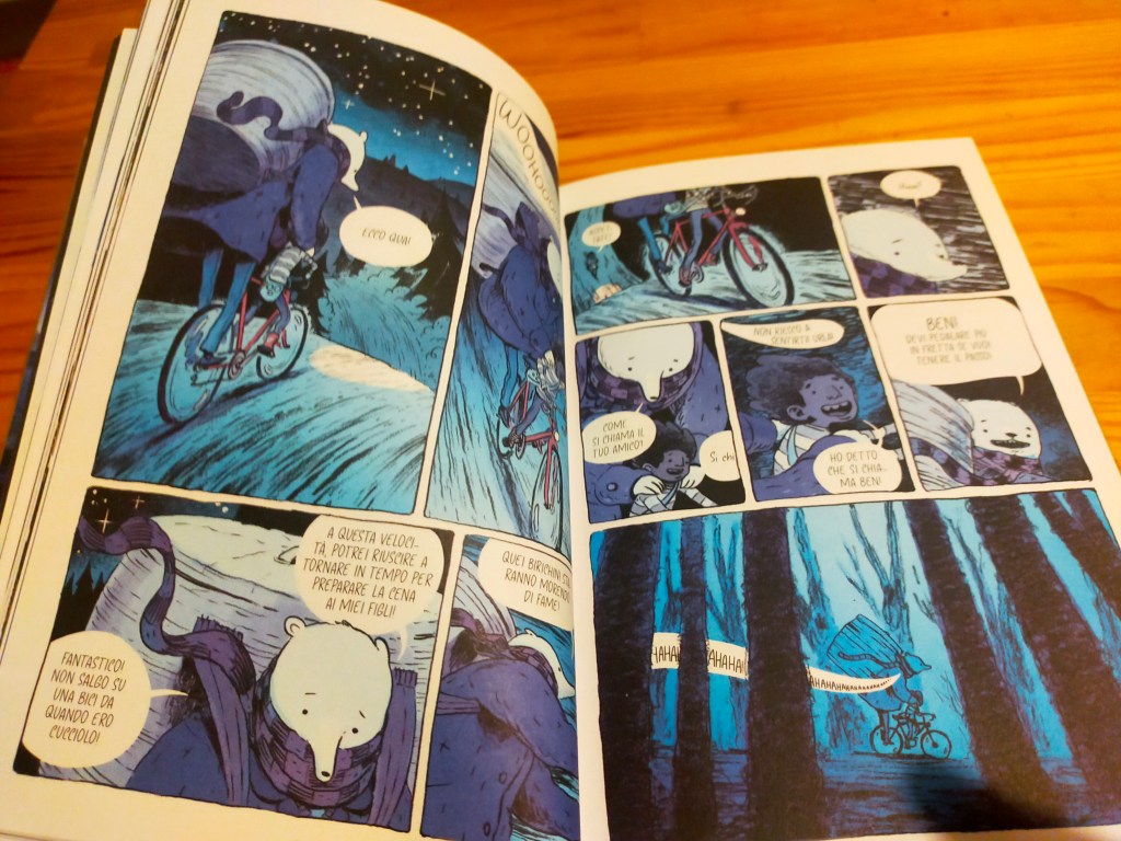 Ora si ritrovano soli, sotto le stelle, su quel ponte che separa il paese dall’avventura che Ben e i suoi amici volevano inseguire. Simbolo del confine tra il mondo conosciuto dell’infanzia e tutto l’ignoto che può venire dopo. Non era con Nathaniel che Ben si era immaginato di superare quel confine, ma Nathaniel è lì, disponibile a mettersi in gioco. E allora i due inforcano le bici. La strada si allontana dal fiume e si addentra nel bosco. E da qui le cose più inaspettate succederanno, sullo sfondo di una notte profondamente blu, in un mondo con molti echi della cultura giapponese del fantastico e in particolare dell’opera di Miyazaki.