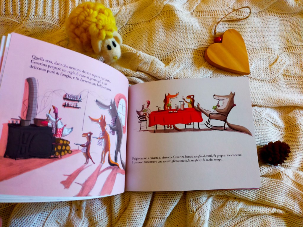 Ecco che i tre minacciosi predatori, intimiditi da Cesarina, iniziano a riordinare la tana e decorarla con graziosi ornamenti natalizi, procacciare libagioni, cuocere graziosi omini biscottini. Cesarina alimenta in loro l’attesa della festa, e al contempo alletta i loro palati, giorno dopo giorno, con manicaretti squisiti.