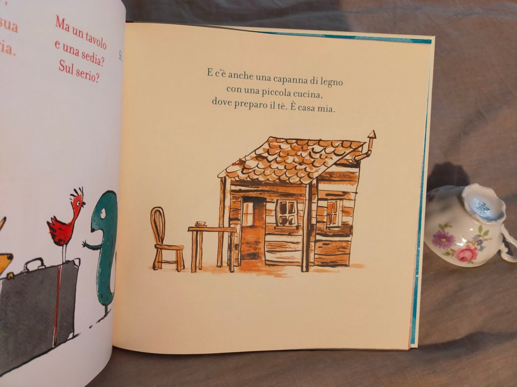 Nella valigia, beh, c’è una tazza da tè, risponde lo stanchissimo sconosciuto. E un tavolo e una sedia, e una casetta con una piccola cucina dove si può fare il tè. È una casetta sulla collina, vicino al mare.
