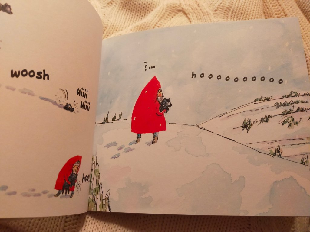 Inverno. Una bambina col parka rosso torna a casa da scuola. Ha iniziato a nevicare, e presto i pochi fiocchi diventano quasi bufera. La bambina, affaticata e un po’ spaventata, incontra un cucciolo di lupo che si è perso, altrettanto indifeso e spaventato. Seguendo gli ululati distanti cercherà di riportarlo dalla mamma. E poi saranno i lupi ad aiutare la bimba ad essere ritrovata e a tornare a casa.