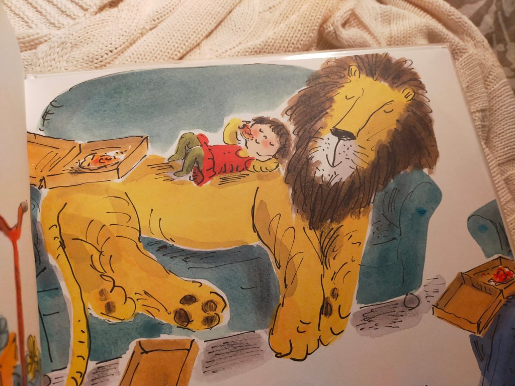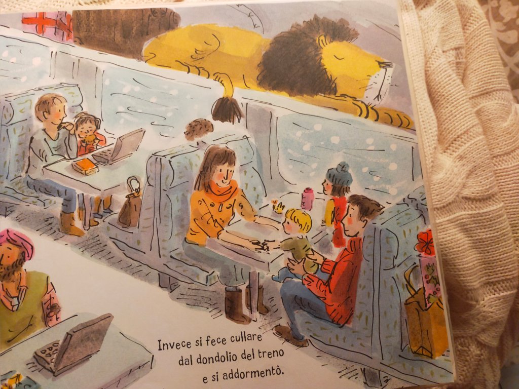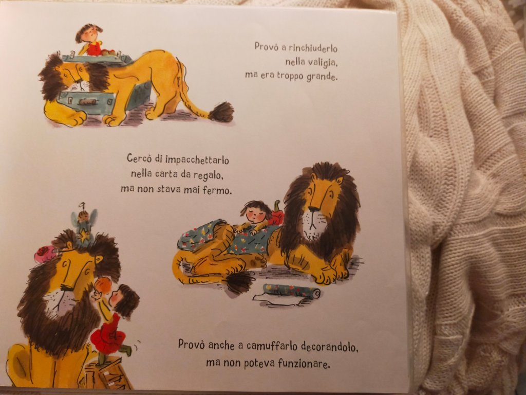 In questo secondo volume della piccola serie inaugurata con Come nascondere un leone, ritroviamo la famiglia della piccola Iris, che si prepara al viaggio per andare a trovare la zia per Natale. I genitori di Ieis le spiegano che il suo leone non può venire, ma lui non si arrenderà e troverà il modo, nonostante vari impicci, di raggiungere la sua piccola amica. Il delizioso surrealismo british della storia richiama un po’ l’atmosfera de Una tigre all’ora del tè (soprattutto per il robusto appetito dell’amico felino). Il tratto dell’autrice ricorda un po’, nello humour e nel calore delle scene, quello di Quentin Blake.