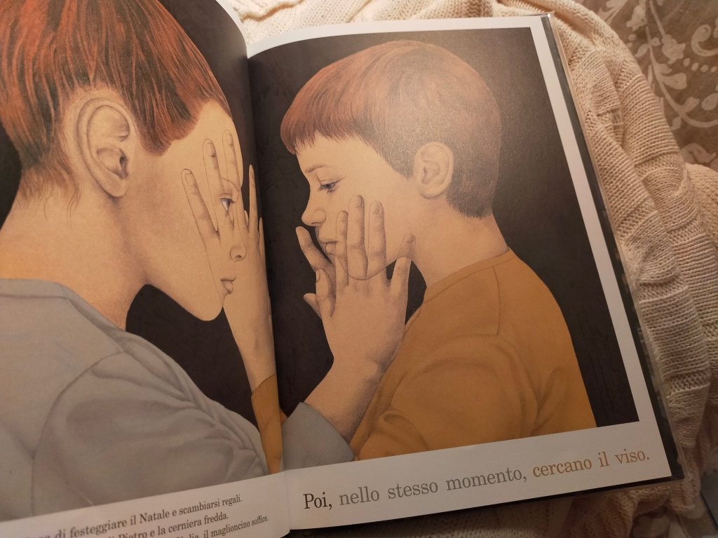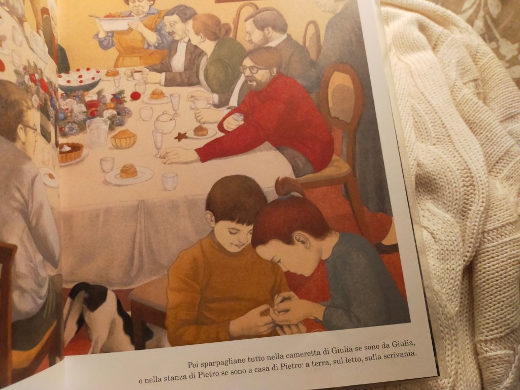 Un pranzo di Natale fa solo da sfondo a questa narrazione intensa e un po’ onirica. È comunque uno sfondo realistico, che riesce a trasmettere la sensazione di noia rispetto ai tempi e modi di stare insieme degli adulti, noia che si traduce nella creazione di un proprio mondo dove trovare rifugio. Una bambina e un bambino, amici da sempre, alle eterne chiacchiere post prandiali dei grandi preferiscono il gioco del buio. Chiusi in una stanza a luci spente, tastano gli oggetti quotidiani più vari immaginando che siano altro. Una scarpa diventa la casa di uno gnomo o altro ancora. Poi Pietro e Giulia si incontrano, sfiorano l’uno il viso dell’altra. E allora, in pagine inondate di luce, vedono l’uno i sogni dell’altra, alcuni dei desideri più profondi. Perché Giulia sa ciò che Pietro desidera, e viceversa.