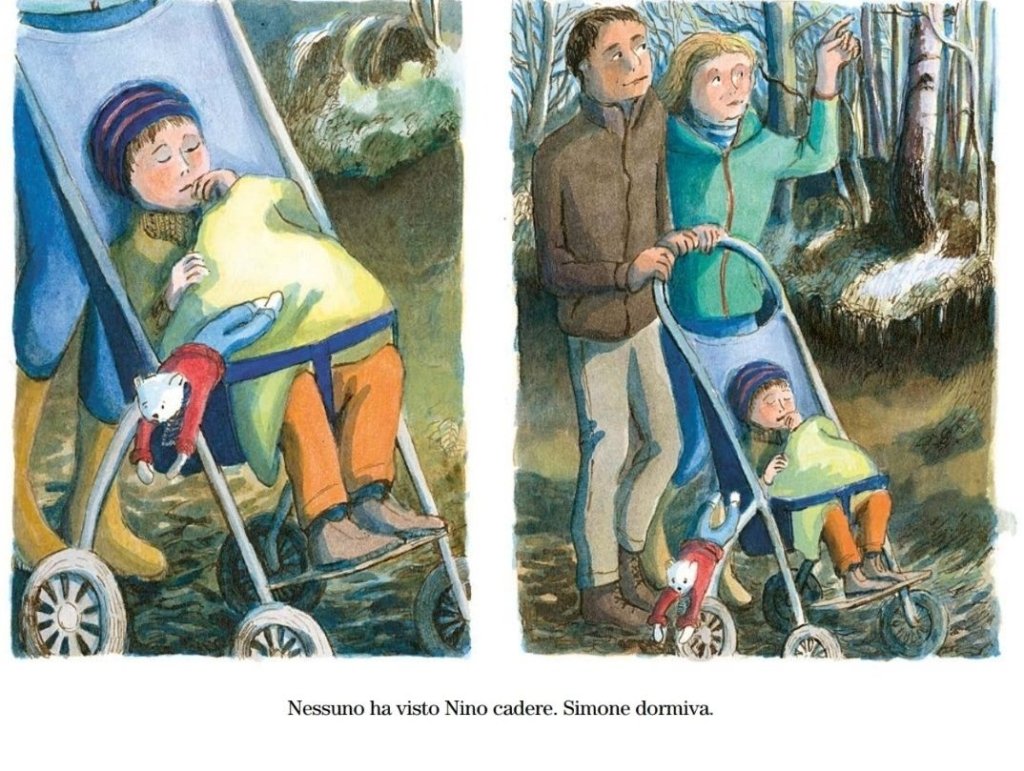 Il bimbo è addormentato, i grandi non se ne accorgono, e per Nino inizia così un’avventura che lo porterà a trovare rifugio e amicizia tra gli animali del bosco.