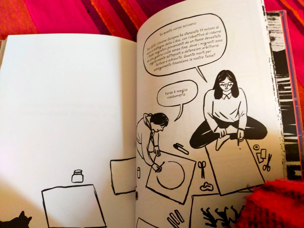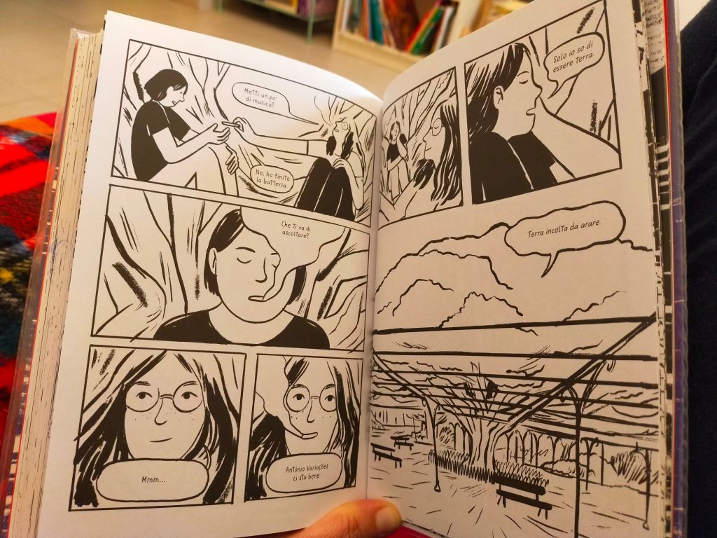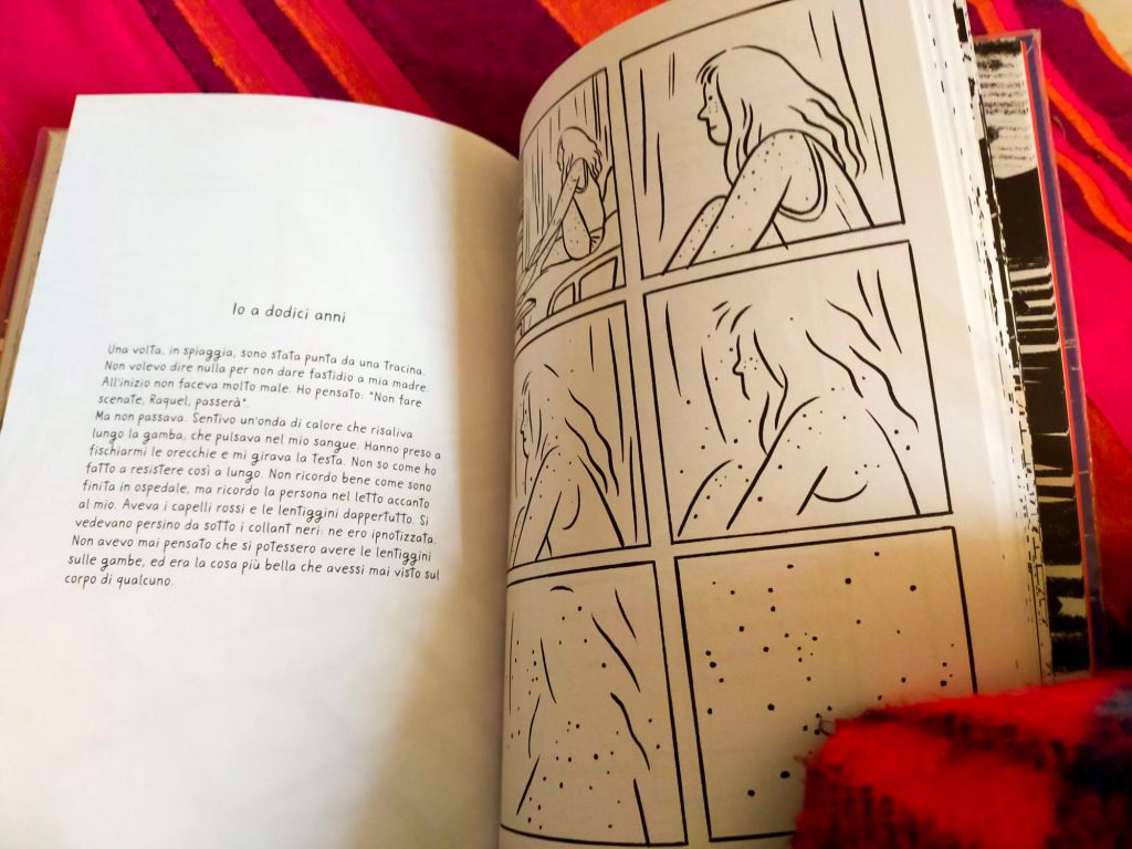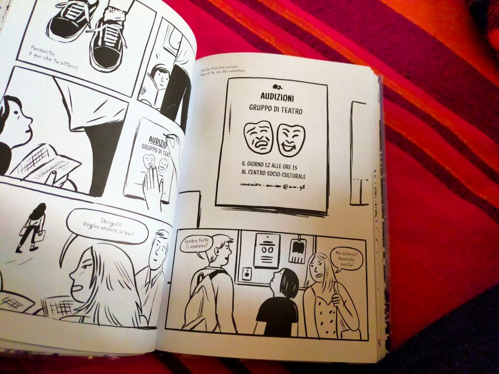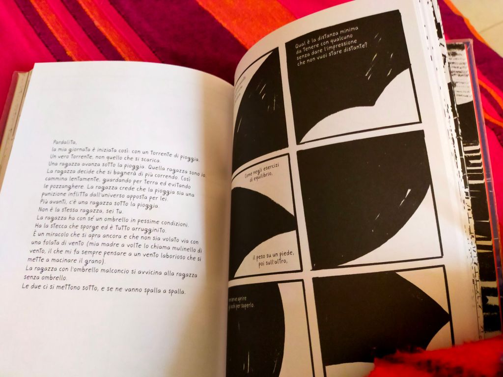 È un libro ibrido, che in realtà non “sta” unicamente dentro la definizione di romanzo grafico. La storia si sviluppa attraverso una miscela di linguaggi: dalla prosa al fumetto all’illustrazione, passando per la poesia e i riferimenti a canzoni. Ognuno di questi elementi ha il suo peso specifico e contribuisce a tenere insieme l’architettura e la tessitura della trama.