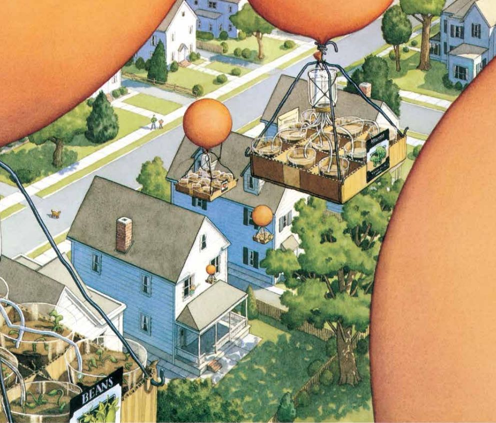 Peperoni, rape, cavolini di Bruxelles, broccoli, rucola, avocado enormi caduti dal cielo vengono accolti con entusiasmo dagli abitanti che se li ritrovano magicamente nel giardino o in mezzo alla strada. E ci si attrezza per utilizzarli nei modi più ovvi e in quelli più creativi: i super ortaggi diventano cibo, sono oggetto di scambi, si trasformano in unità immobiliari…