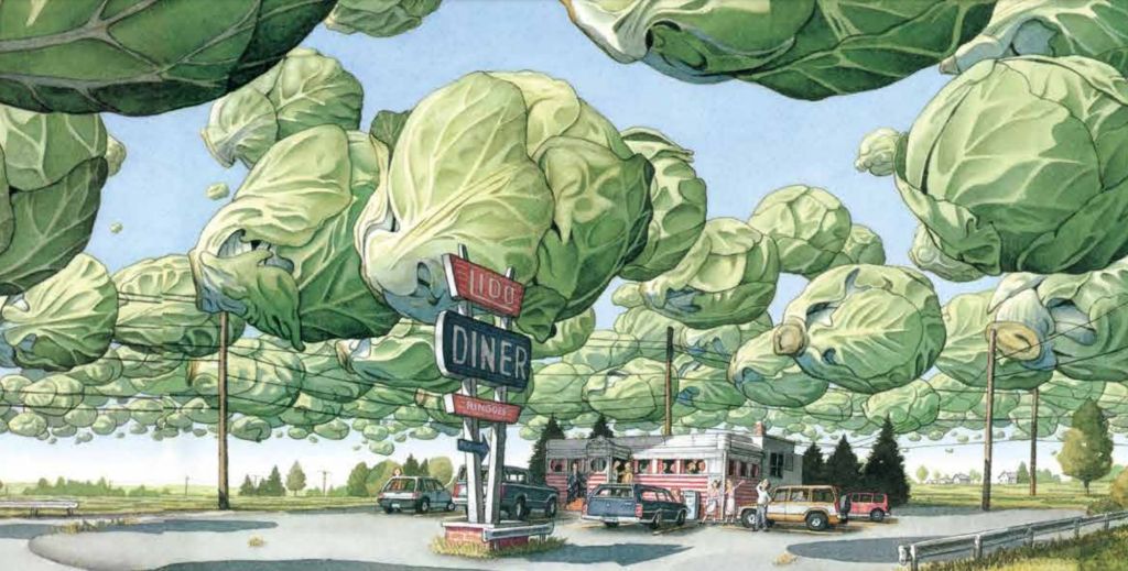 La risposta la troverete alla fine di questo albo surreale ed incantevole, con echi fiabeschi e pop (a me ha ricordato, in tutt’altra salsa, Allumette di Tomi Ungerer). In un’epoca di crisi ambientale nella quale ci aspettiamo che dal cielo possano piovere solo catastrofi naturali, i pacifici broccoli di Wiesner atterrano gentili e generosi senza un perché, come un improbabile segnale di pace dal cosmo.