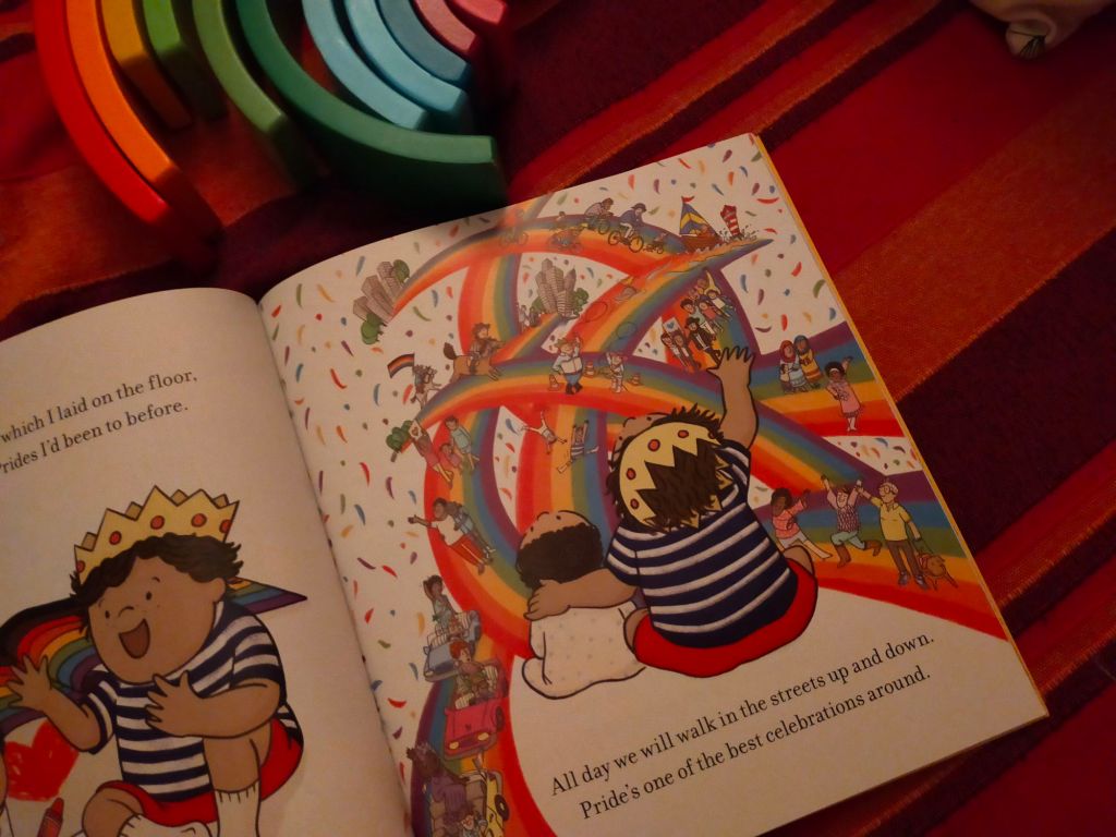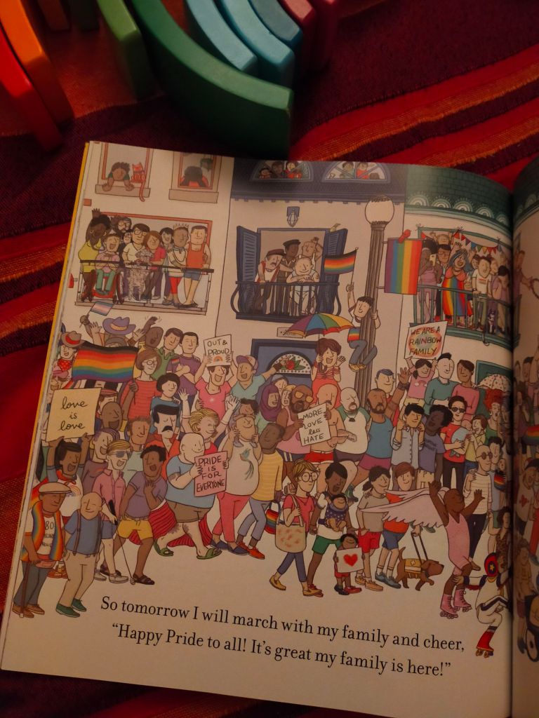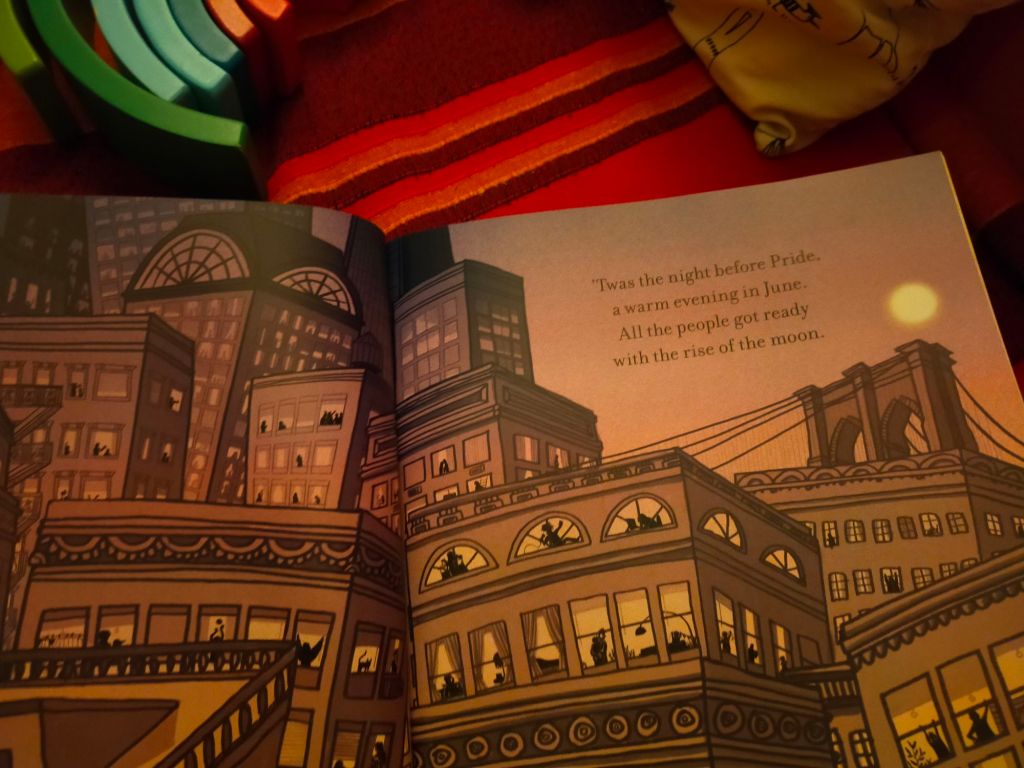 Comunque, se nel testo di Moore viviamo l’attesa di Babbo Natale in una notte carica di magia, in questo nuovo libro a figure la voce narrante è quella di un bambino che sta per andare a dormire e si prepara a partecipare al Pride della sua città il giorno dopo insieme alle sue due mamme.