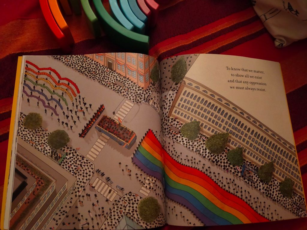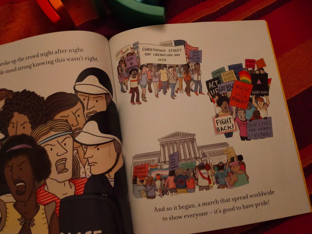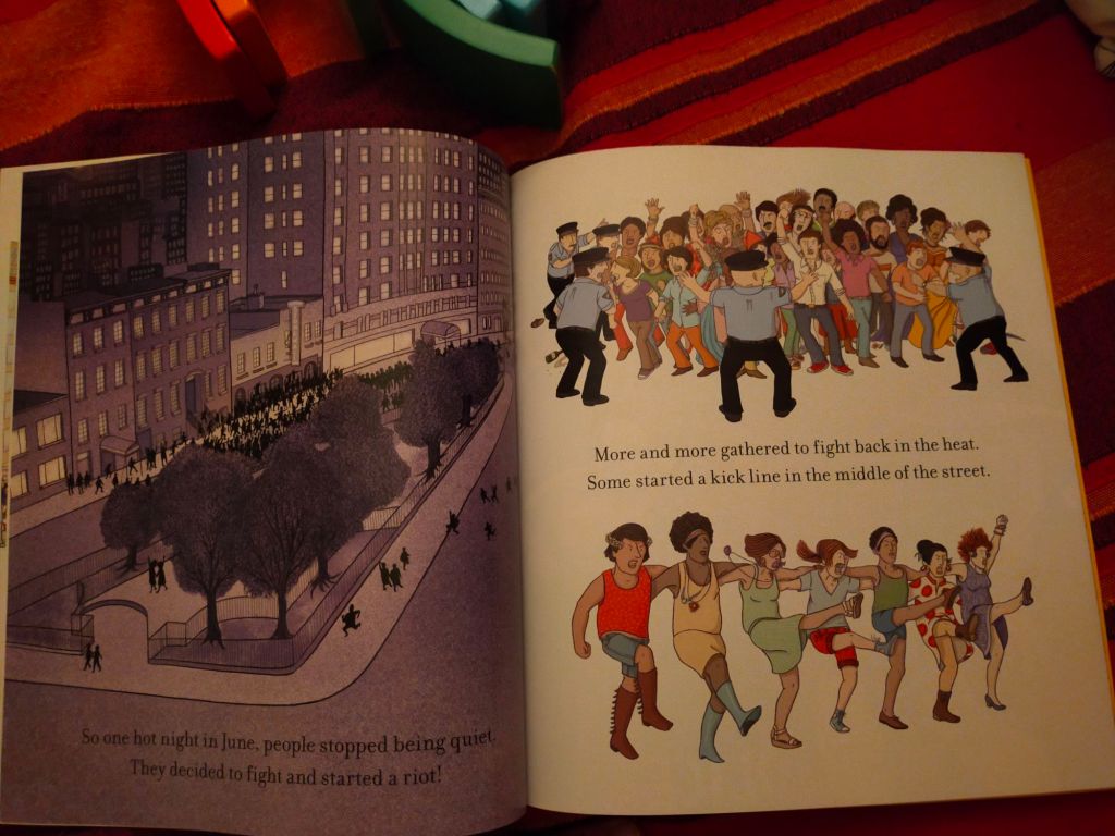 Anche qui il testo è in versi, e ci accompagna tra tavole variopinte e gioiose, dal tono solo apparentemente leggero. Con delicatezza si entra, infatti, nel racconto del “primo Pride”, che fu una rivolta, quella dello Stonewall Inn a New York a giugno del 1969.