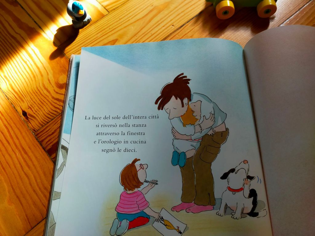 A chiudere il cerchio, l’autore ci riporta nel soggiorno, a casa di Giulia e Leo. Qui, Giulia e la mamma accolgono con emozione il primo passo di Leo – un fatto piccolo ma carico di significato, soggettivamente, per il bimbo e chi gli sta vicino – mentre la luce del sole, che sta abbracciando via via tutti i luoghi della città, si riversa nella stanza.
