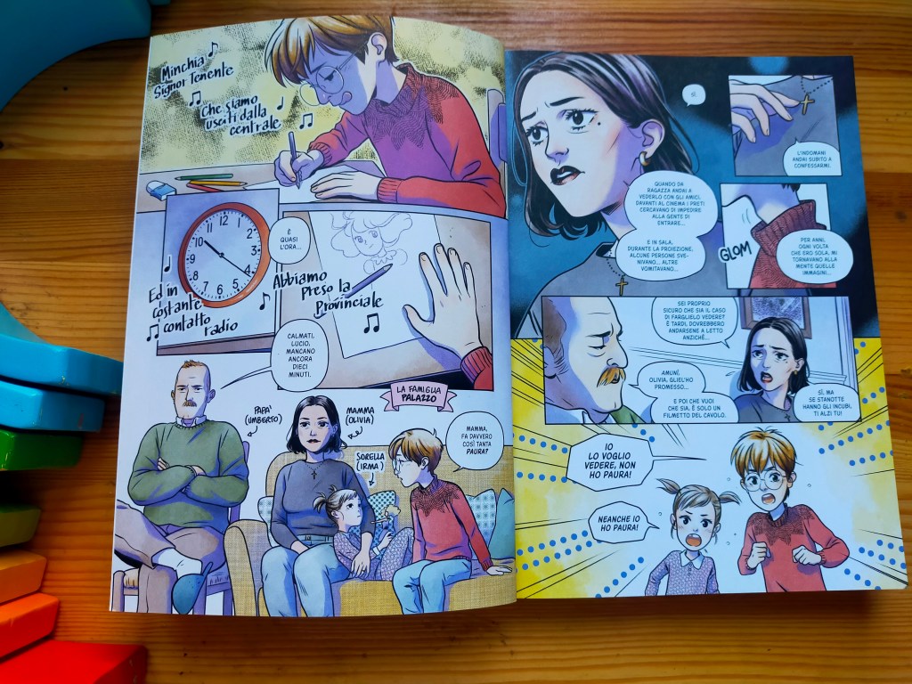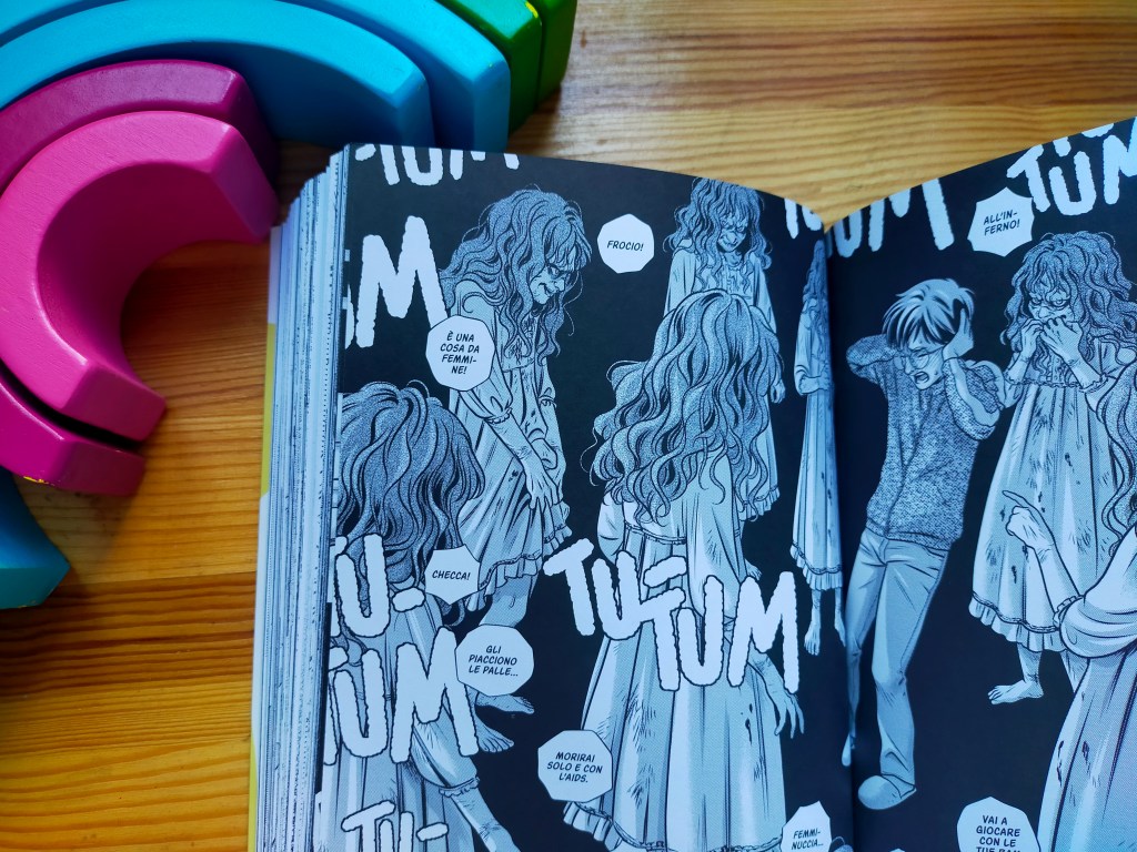 Geniale l’uso che Macaione fa della bambina posseduta de L’esorcista: un’immagine che tormenta Lucio e che arriva a rappresentare ed incarnare tutte le sue paure, sia nella relazione con i genitori, sia rispetto allo sviluppo della propria identità. Ecco, io non ho mai guardato L’esorcista, ma l’angoscia che questo personaggio rappresenta per Lucio, essendo cresciuta lesbica in un contesto culturale simile negli stessi anni, ohhh sì, la trovo particolarmente familiare e condivisibile.