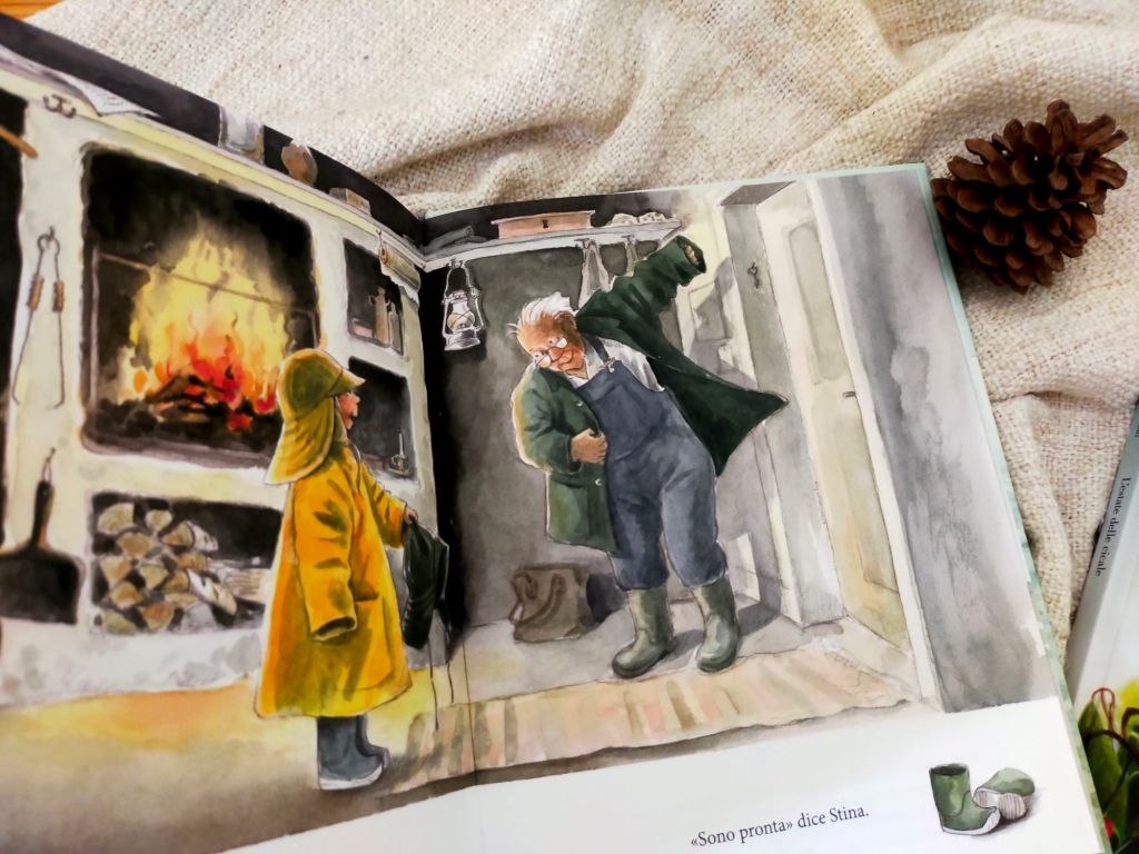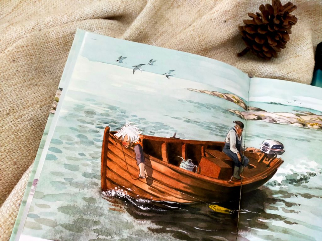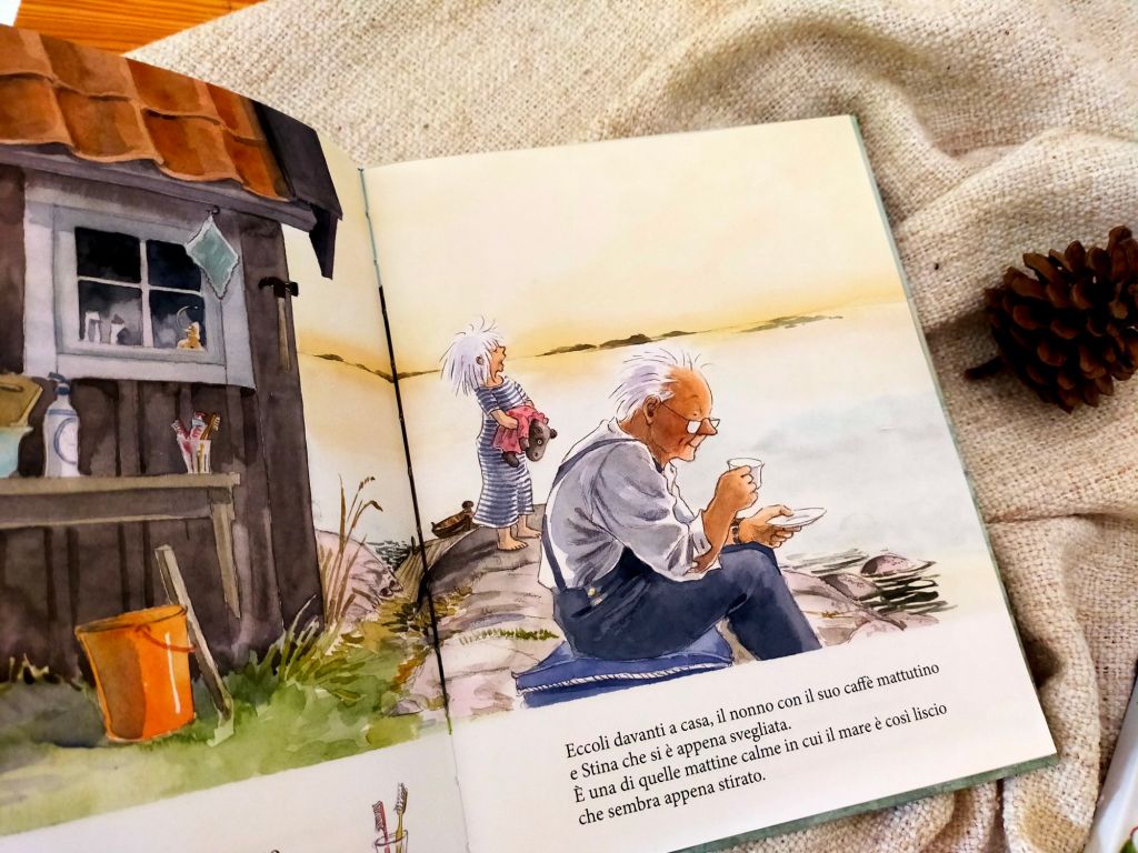 È un albo che sa di mare, di vento, di relazioni calde e rassicuranti come una coperta morbida quando fuori fa freddo, di un’infanzia felicemente selvatica. Il testo ci proietta immediatamente nel dialogo costante tra nonno e nipote. Ci sembra di sentire il ritmo del loro chiacchiericcio, con la voce saltellante e cristallina di lei, la pacatezza accogliente e curiosa di lui e i gabbiani in sottofondo.