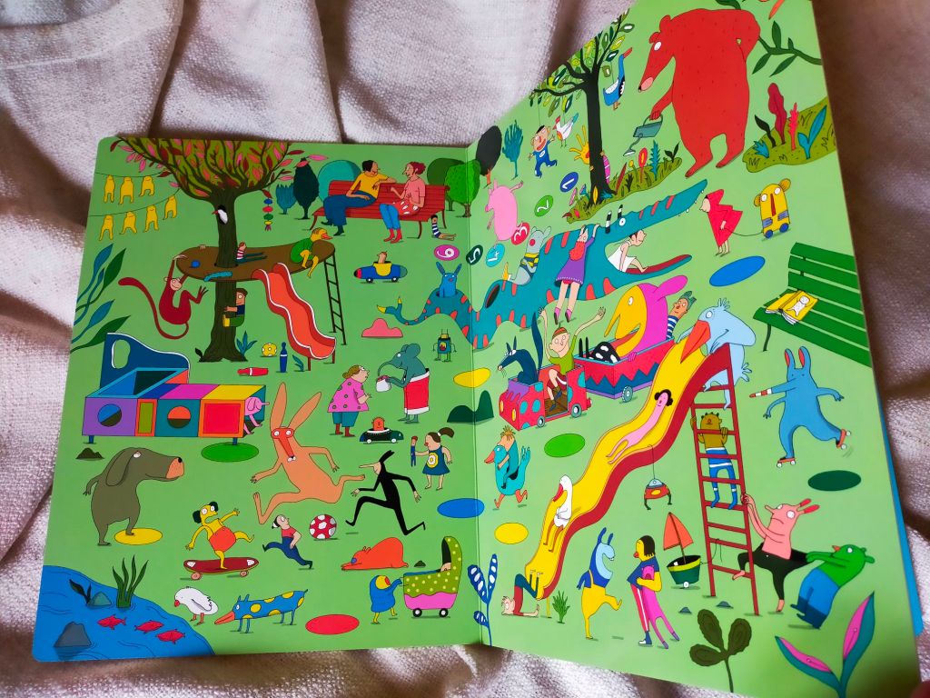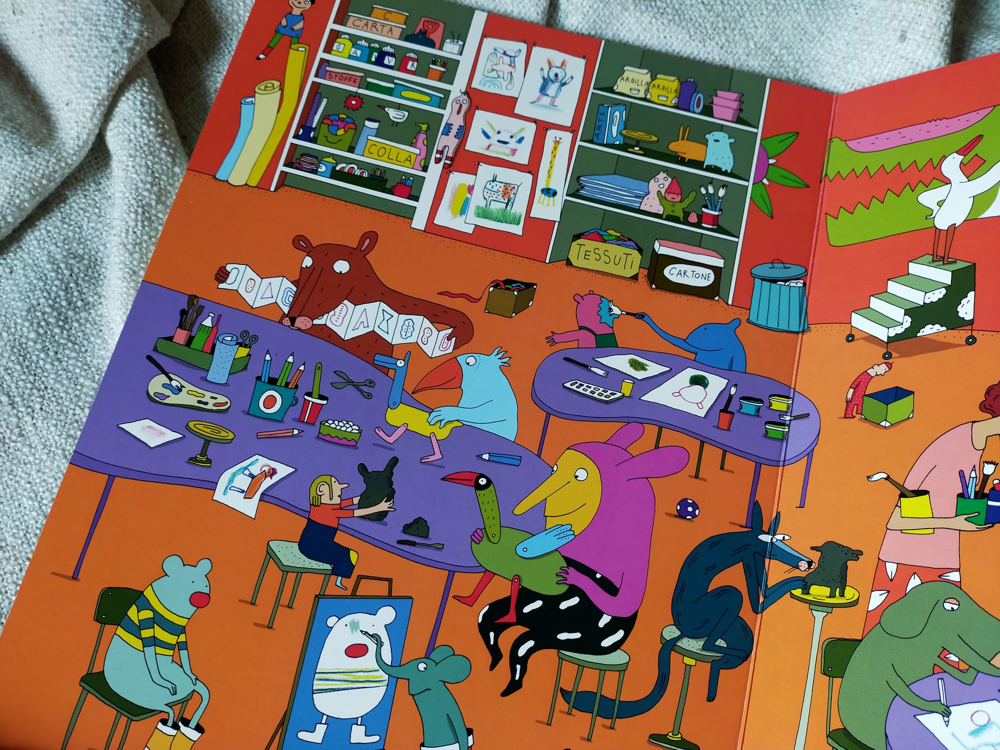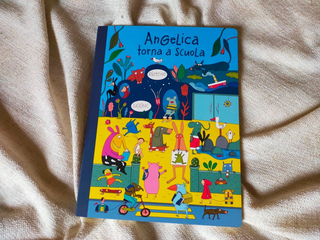 Un grande cartonato silenzioso in stile Wimmelbuch, adatto anche a mani ed occhi piccolini, Angelica torna a scuola ci invita a tuffarci in un mondo a cavallo tra il surreale e il quotidiano.
