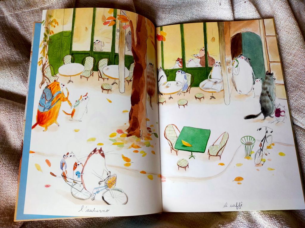 Seguiamo tra le sue pagine la quotidianità di un quartiere (dall’aria molto francese) popolato interamente da gatti antropomorfi. Le stagioni si avvicendano e noi le vediamo scorrere osservando il brulicante movimento di una varietà di personaggi di tutte le età, che a volte ritroviamo a distanza di tempo.