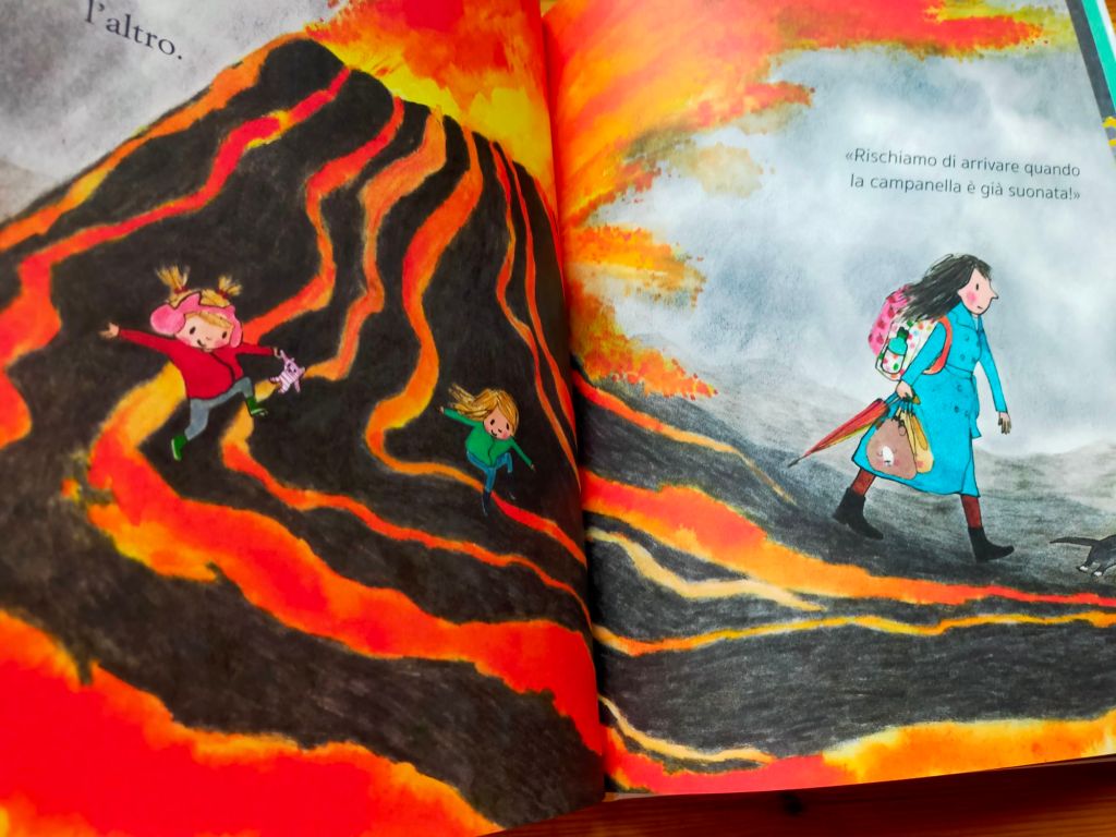 Così, mentre la mamma cammina davanti a loro, placida e carica di zaini, le due bambine affrontano un vulcano in eruzione, camminano su un cavo sospeso su una voragine e vivono tante altre avventure, tutte durante il tragitto a piedi verso la scuola. La realtà quotidiana si trasfigura dando vita ad un meraviglioso immaginario condiviso, al quale probabilmente le due sorelle ritorneranno con la memoria anche da grandi.