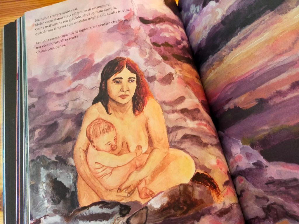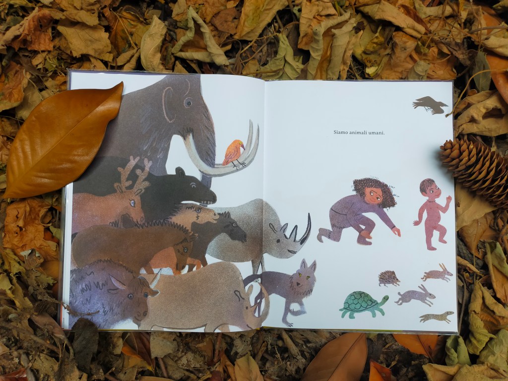 Chiudiamo il cerchio con un albo illustrato a cavallo tra divulgazione e narrativa, che ci propone un’esplorazione narrante di ciò che la nostra specie era in origine.