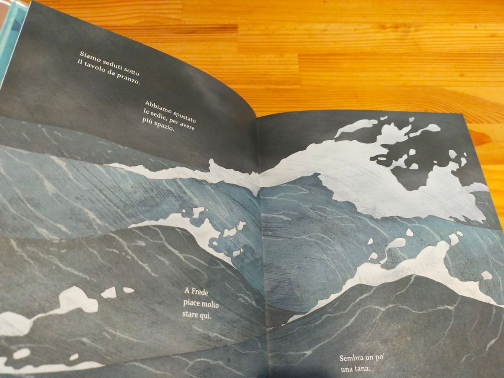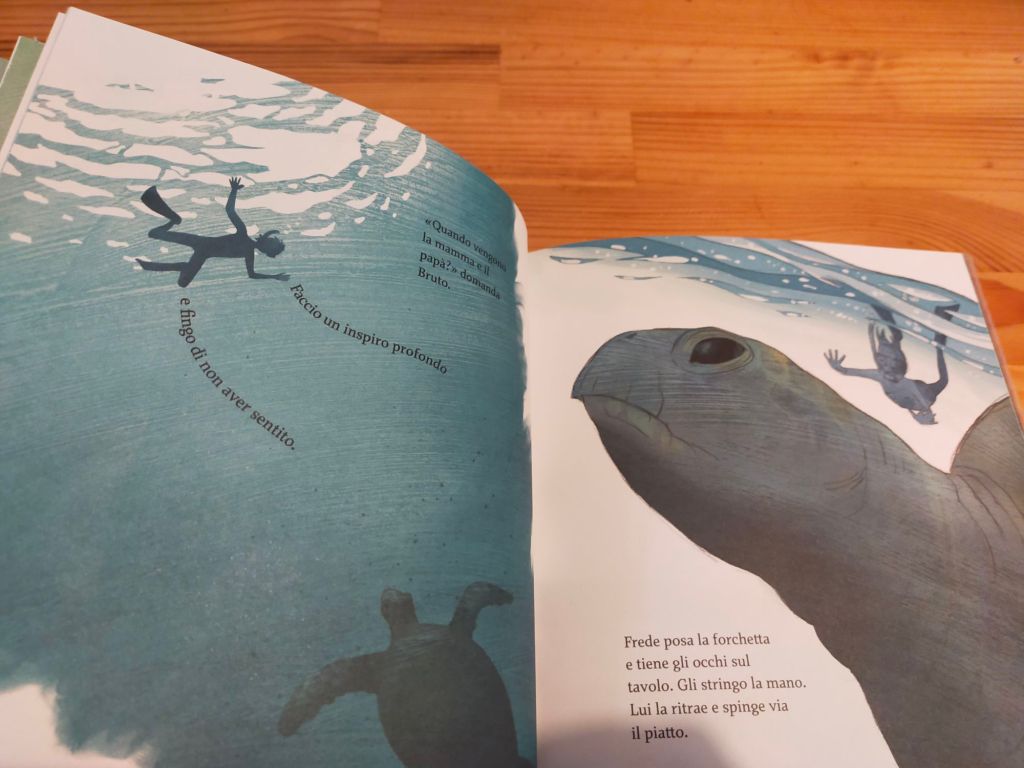 La narrazione si articola magistralmente sul doppio registro del testo e delle immagini, sviluppando una potente e onirica metafora acquatica che sembra richiamare i mari della preistoria, e che si intreccia poi sul piano visivo con la passione del bambino per i dinosauri.