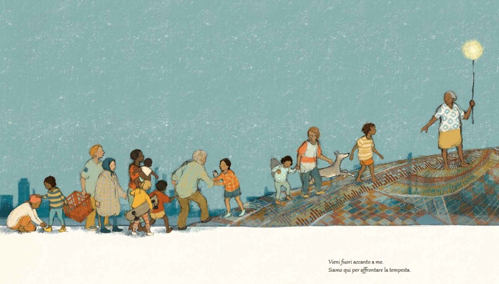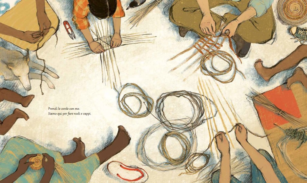 Un albo suggestivo, che inizia sommessamente, in una periferia del mondo globalizzato dove il cemento avanza lambendo sempre più gli spazi naturali, minacciati dal cambiamento climatico. Vieni, dice una donna anziana ad un bambino, siamo qui per imparare. Il bambino deve imparare a raccogliere i germogli di giunchi, che poi serviranno per intrecciare tappeti.